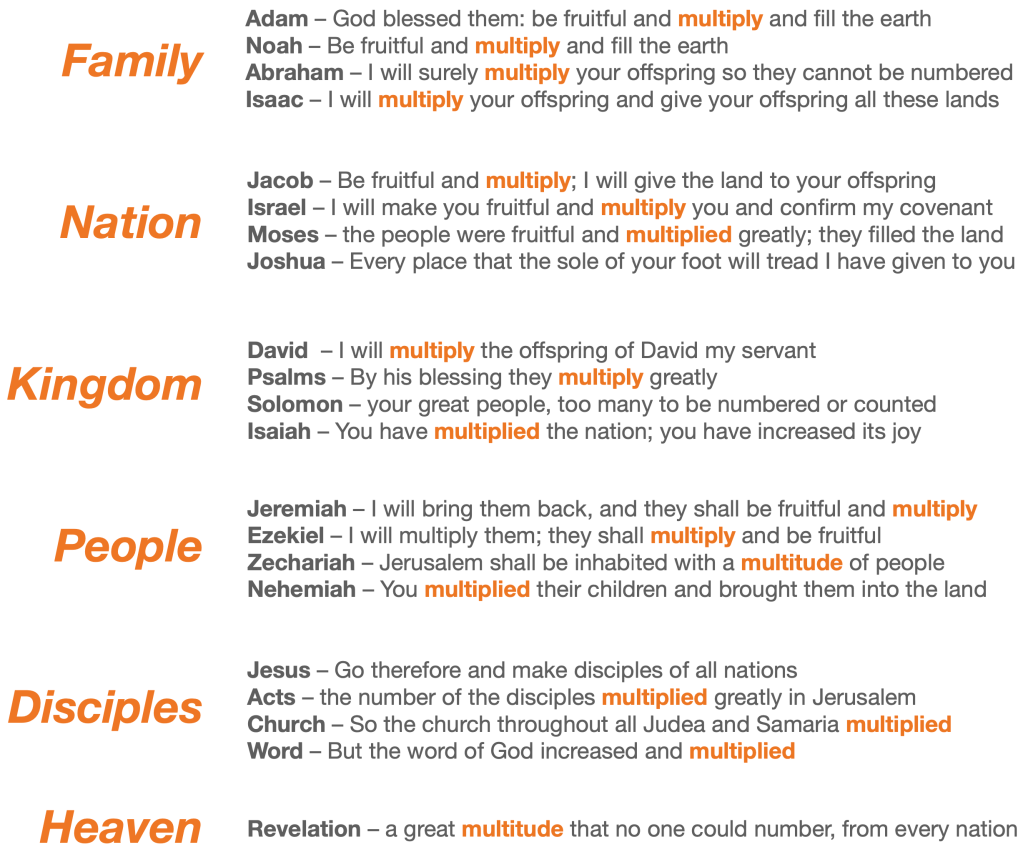 These are all great, but I think they missed an obvious one: to multiply. This is a theme from creation (multiply your family) through Jesus’ time (multiply disciples) to heaven (a great multitude).